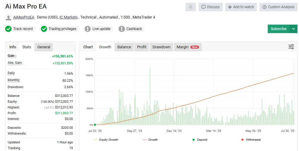 Yes, the EA employs a smart grid recovery system with 1.5x lot scaling, which helps recover from drawdowns. Users should understand the risk profile associated with this type of strategy. - Is a VPS required to run AiMaxPro EA?