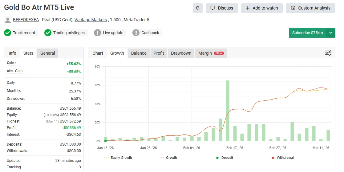 Another advantage of Gold BO ATR EA is its low starting requirement. With a recommended minimum deposit of around $50, traders can start testing and growing their account without needing a large investment.