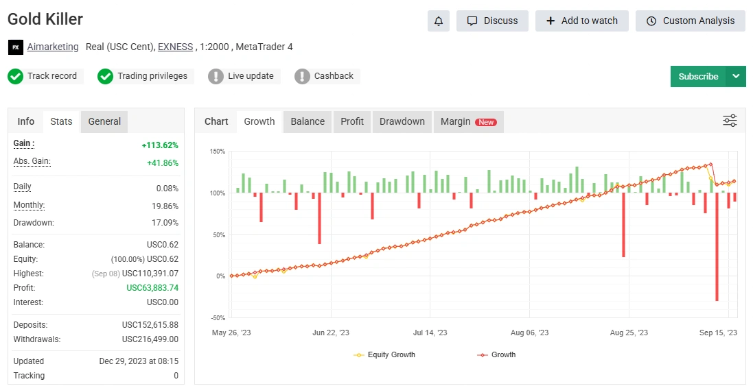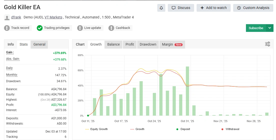 The Gold Killer EA is built for trading XAUUSD (Gold) on MetaTrader 5, using a mix of trend-following logic and breakout analysis to catch strong moves in volatile market conditions.