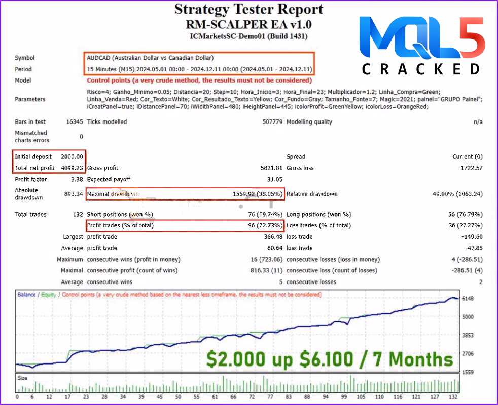 - With a $2,000 capital, the robot earned $4,099 in 7 months, with a 38.05% maximum drawdown and a 72.73% win rate, ensuring stable and secure trading.