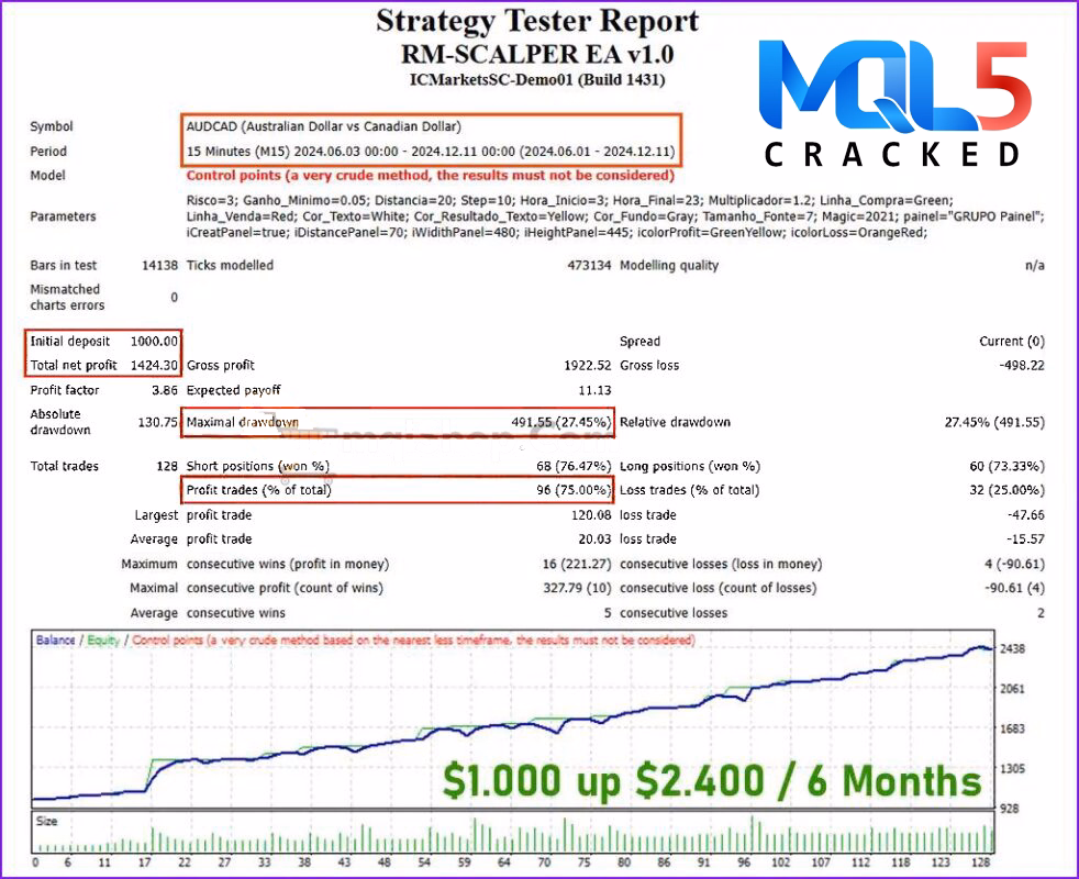 - With a $1,000 investment, the robot generated $1,424 in profit over 6 months, maintaining a 27.45% maximum drawdown and a 75% win rate. Stable and reliable performance ensured safety throughout.