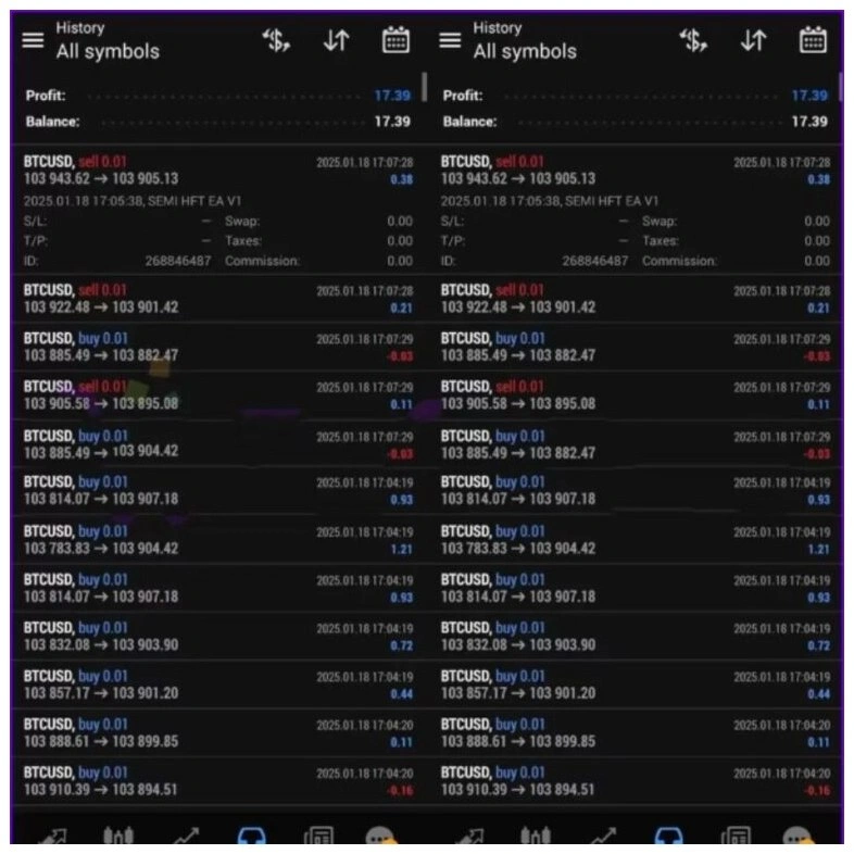 SEMI HFT EA is a top-tier Expert Advisor designed exclusively for MetaTrader 4 (MT4). It leverages semi-high-frequency trading strategies to ensure rapid trade execution and capitalize on market opportunities. With cutting-edge algorithms, robust risk management tools, and compatibility across forex, commodities, and indices, this EA offers a flexible and efficient trading solution. Its intuitive interface and proven reliability in live trading make it an excellent choice for traders aiming to increase profitability while avoiding emotional decision-making.