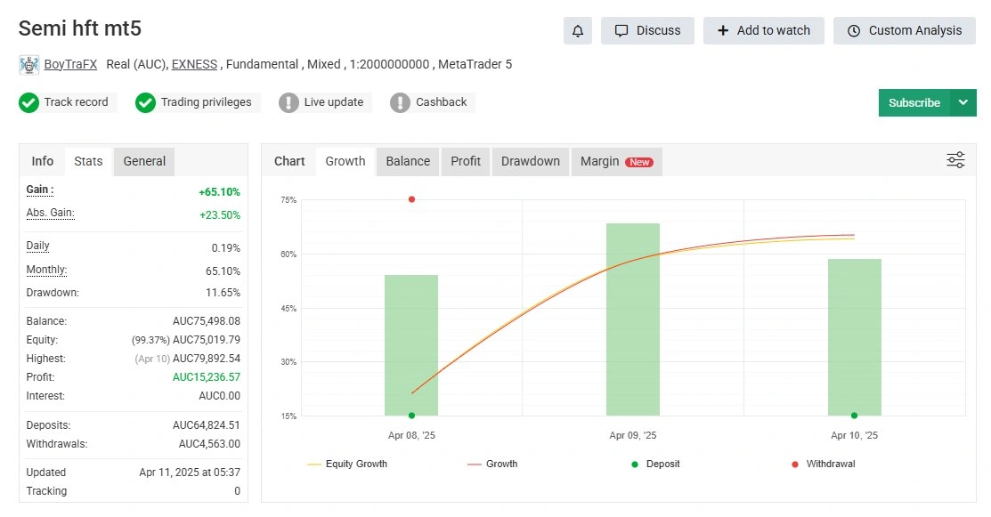 Semi HFT EA is a fully automated Expert Advisor developed for MetaTrader 5 (MT5). It uses a semi–high-frequency trading strategy combined with adaptive algorithms and advanced risk management to trade markets such as BTCUSD and XAUUSD.