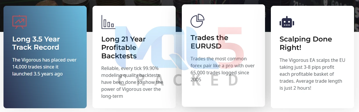 Proven Long-Term Profitability: With over two decades of verified backtesting results, Vigorous EA has consistently delivered reliable performance on the EUR/USD pair, giving traders confidence in its strategy over varying market conditions.